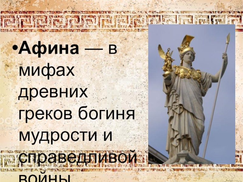 Слайд 12Афина — в мифах древних греков богиня мудрости и справедливой войны.