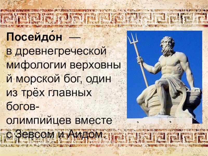 Слайд 14Посейдо́н  — в древнегреческой мифологии верховный морской бог, один из трёх главных богов-олимпийцев вместе с Зевсом и Аидом.