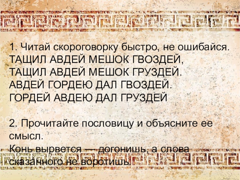 1. Читай скороговорку быстро, не ошибайся.ТАЩИЛ АВДЕЙ МЕШОК ГВОЗДЕЙ,ТАЩИЛ АВДЕЙ МЕШОК ГРУЗДЕЙ.АВДЕЙ ГОРДЕЮ ДАЛ ГВОЗДЕЙ.ГОРДЕЙ АВДЕЮ ДАЛ ГРУЗДЕЙ2. Прочитайте пословицу и объясните ее смысл.Конь вырвется — догонишь, а слова сказанного не воротишь.