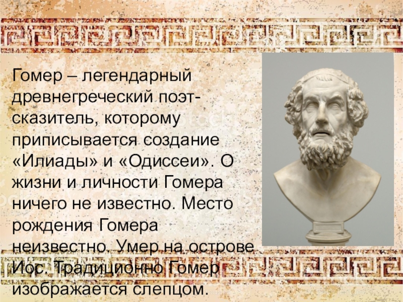 Слайд 6Гомер – легендарный древнегреческий поэт-сказитель, которому приписывается создание «Илиады» и «Одиссеи».