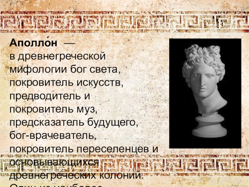 Слайд 15Аполло́н  — в древнегреческой мифологии бог света, покровитель искусств, предводитель и покровитель муз, предсказатель