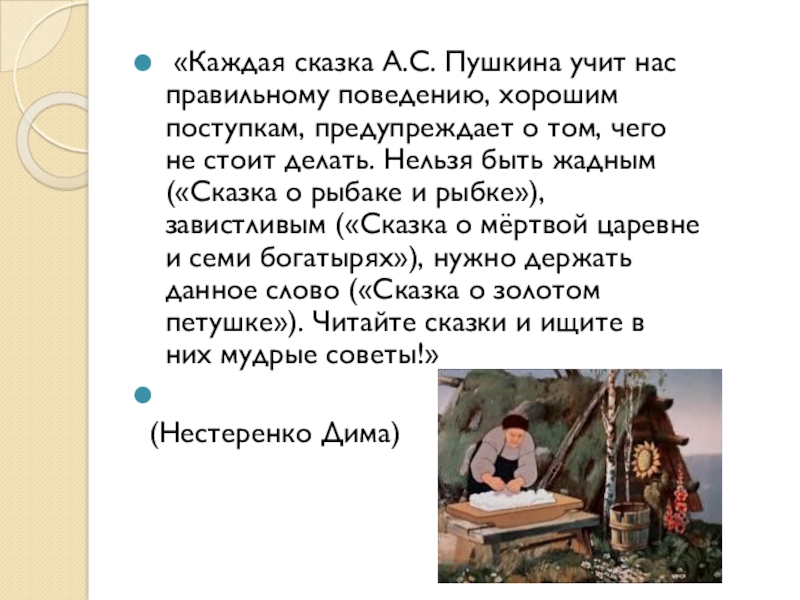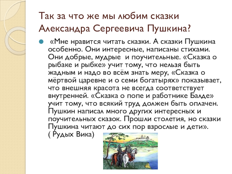 «Мне нравится читать сказки. А сказки Пушкина особенно. Они интересные, написаны стихами. Они добрые, мудрые и поучительные. «Сказка о рыбаке и рыбке» учит тому, что нельзя быть жадным и надо во всём знать меру, «Сказка о мёртвой царевне и о семи богатырях» показывает, что внешняя красота не всегда соответствует внутренней. «Сказка о попе и работнике Балде» учит тому, что всякий труд должен быть оплачен. Пушкин написал много других интересных и поучительных сказок. Прошли столетия, но сказки Пушкина читают до сих пор взрослые и дети». ( Рудых Вика)