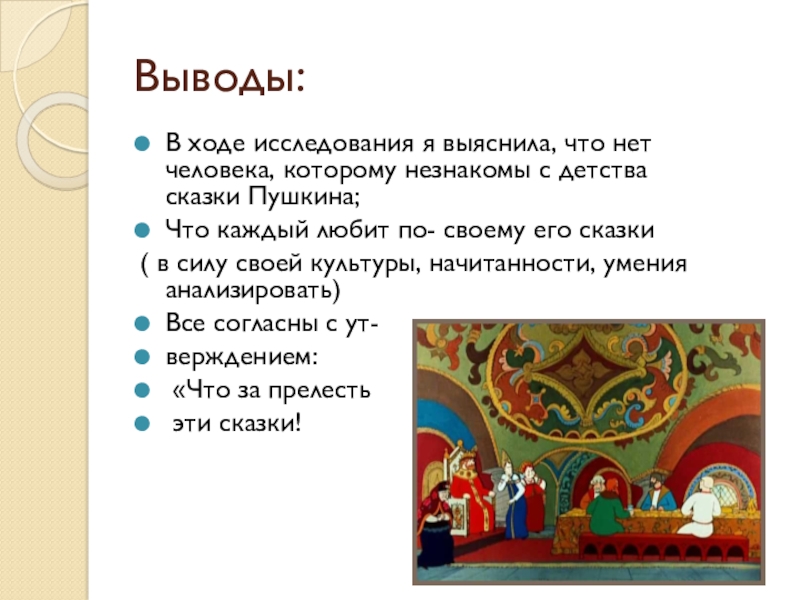 Выводы:В ходе исследования я выяснила, что нет человека, которому незнакомы с детства сказки Пушкина;Что каждый любит по-