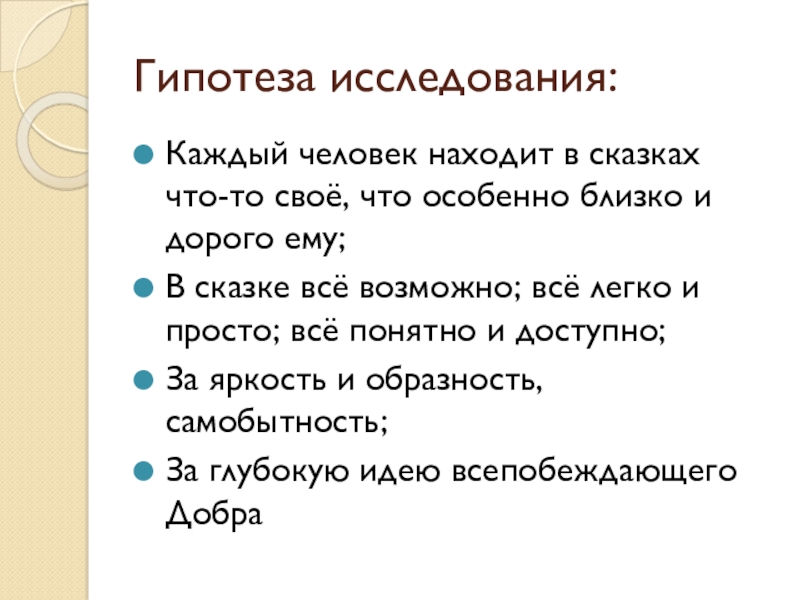 Гипотеза исследования:Каждый человек находит в сказках что-то своё, что особенно близко и дорого ему;В сказке всё возможно;