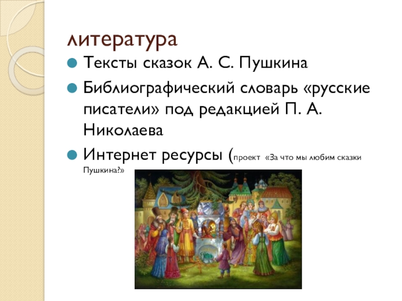 литератураТексты сказок А. С. ПушкинаБиблиографический словарь «русские писатели» под редакцией П. А. НиколаеваИнтернет ресурсы (проект «За что