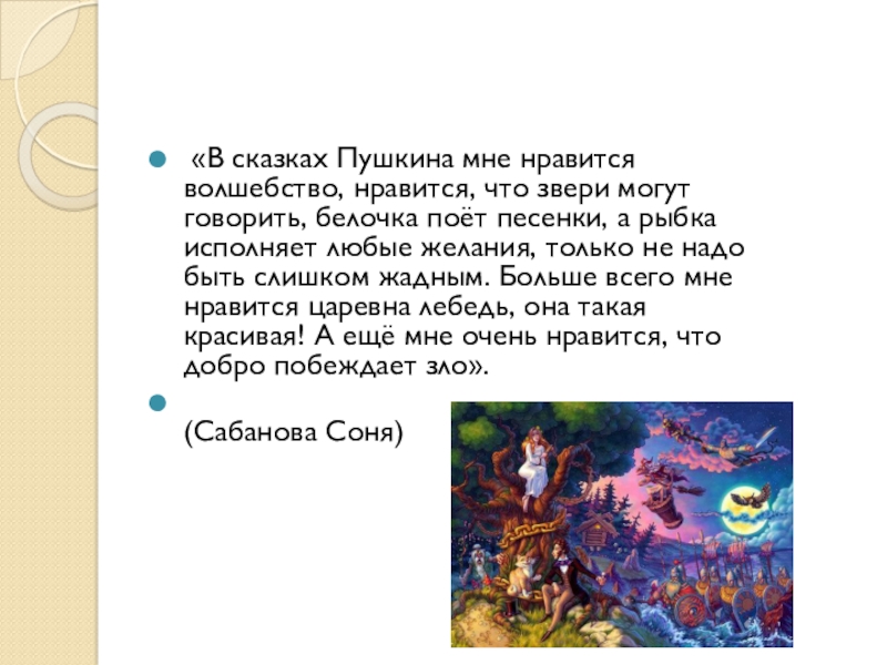 Слайд 6 «В сказках Пушкина мне нравится волшебство, нравится, что звери могут