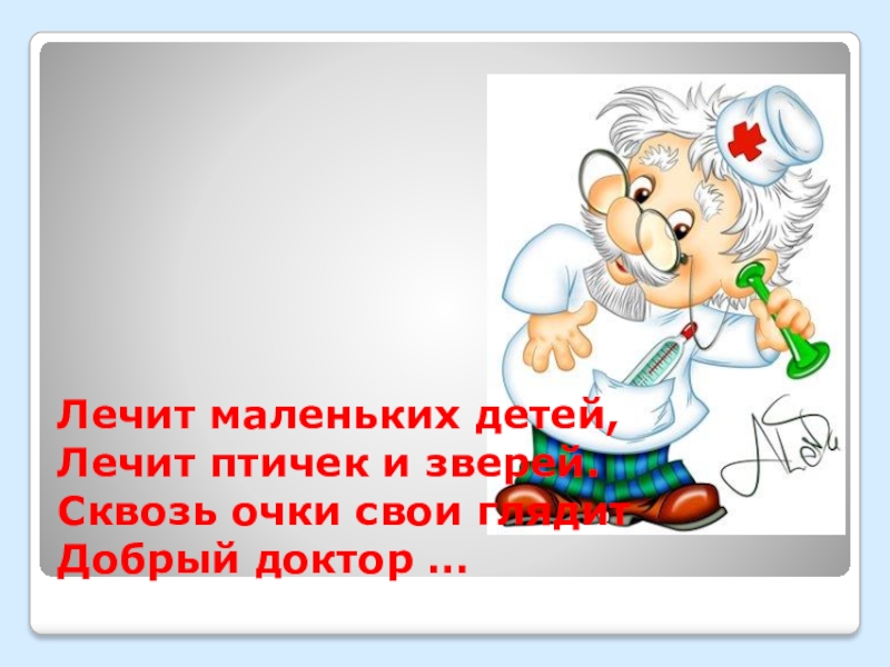 Лечит маленьких детей, Лечит птичек и зверей. Сквозь очки свои глядит Добрый доктор …
