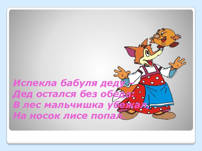 Испекла бабуля деду – Дед остался без обеда: В лес мальчишка убежал, На носок лисе попал.