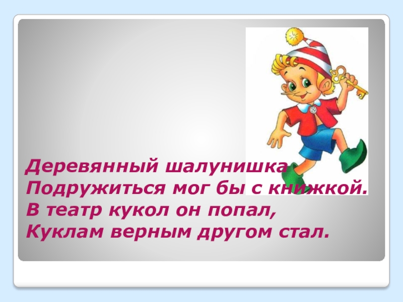 Деревянный шалунишка Подружиться мог бы с книжкой. В театр кукол он попал, Куклам верным другом стал.