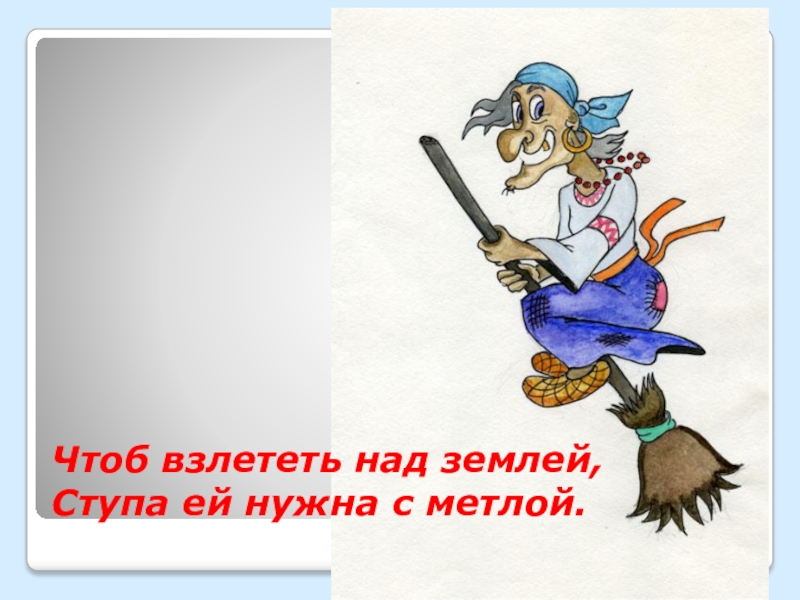 Слайд 6Чтоб взлететь над землей, Ступа ей нужна с метлой.