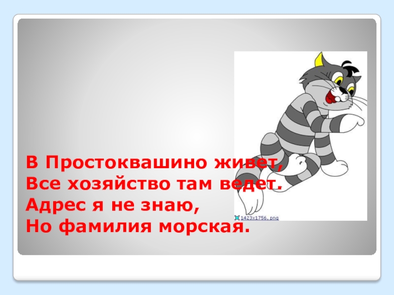 Слайд 9В Простоквашино живет, Все хозяйство там ведет. Адрес я не знаю, Но фамилия морская.