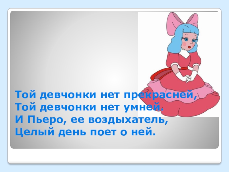 Слайд 10Той девчонки нет прекрасней, Той девчонки нет умней. И Пьеро, ее воздыхатель, Целый день