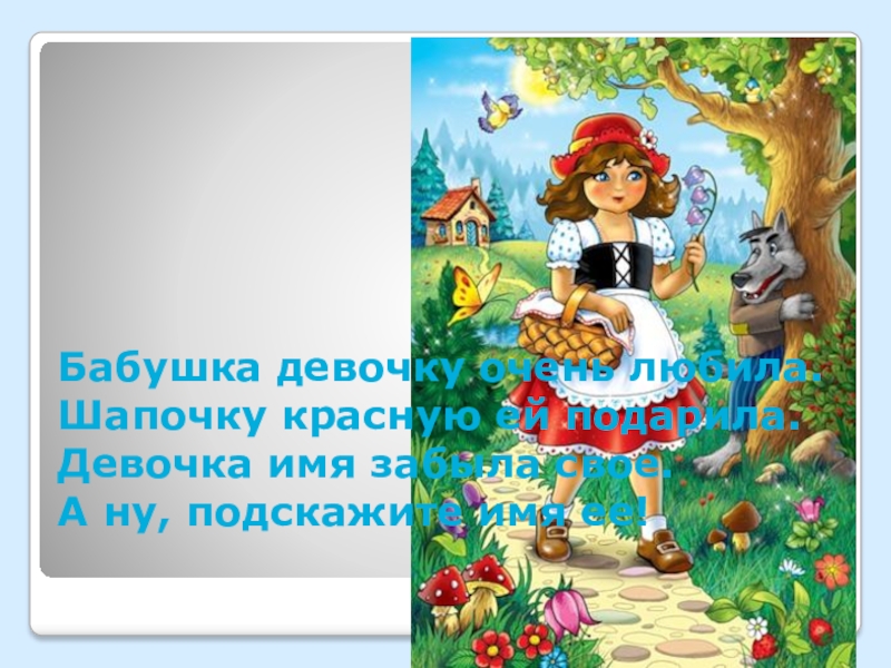 Бабушка девочку очень любила. Шапочку красную ей подарила. Девочка имя забыла свое. А ну, подскажите имя ее!