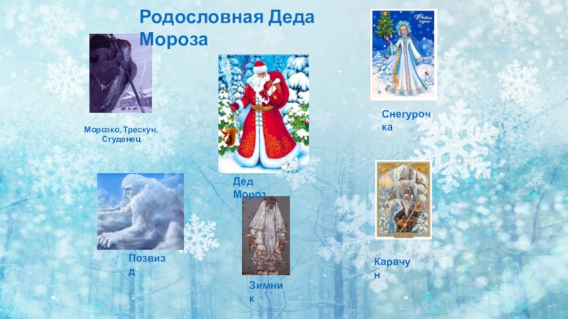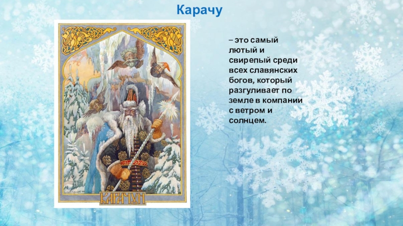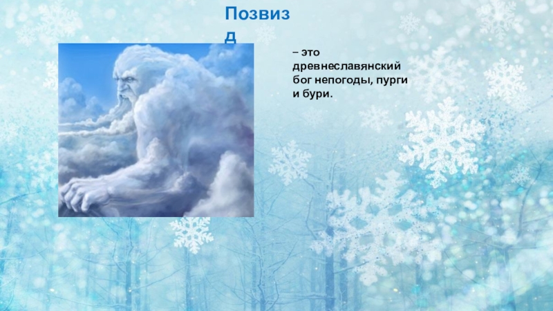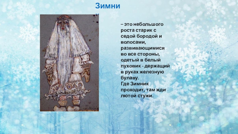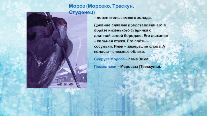 старичка с длинной седой бородою. Его дыхание – сильная стужа. Его слёзы – сосульки. Иней – замерзшие слова. А волосы – снежные облака.