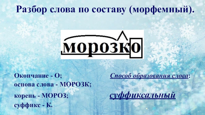 Бриллиантовый, железный, искристый, привередливый, радостный, развеселившийся, розовоносый, розовый, скифский, сляклый, укрепительный, упорный, хрустящий. Декабрьский, крещенский, ночной, полярный, сибирский, сретенский, февральский, январский и т. п.