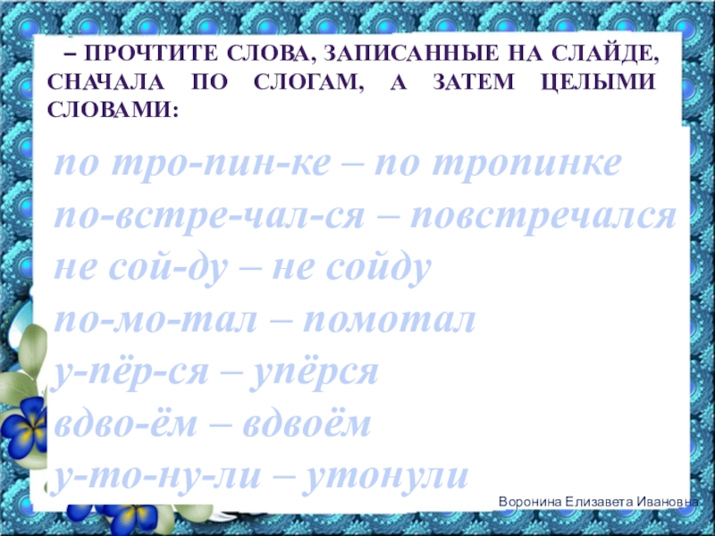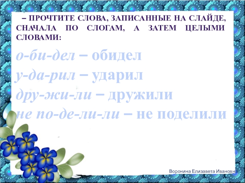– Прочтите слова, записанные на слайде, сначала по слогам, а затем целыми словами: