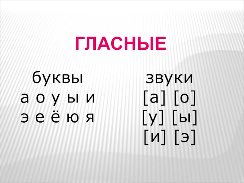 ГЛАСНЫЕбуквыа о у ы и э е ё ю я звуки[а] [о] [у] [ы] [и] [э]