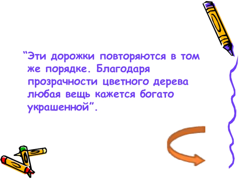 “Эти дорожки повторяются в том же порядке. Благодаря прозрачности цветного дерева любая вещь кажется богато украшенной”.