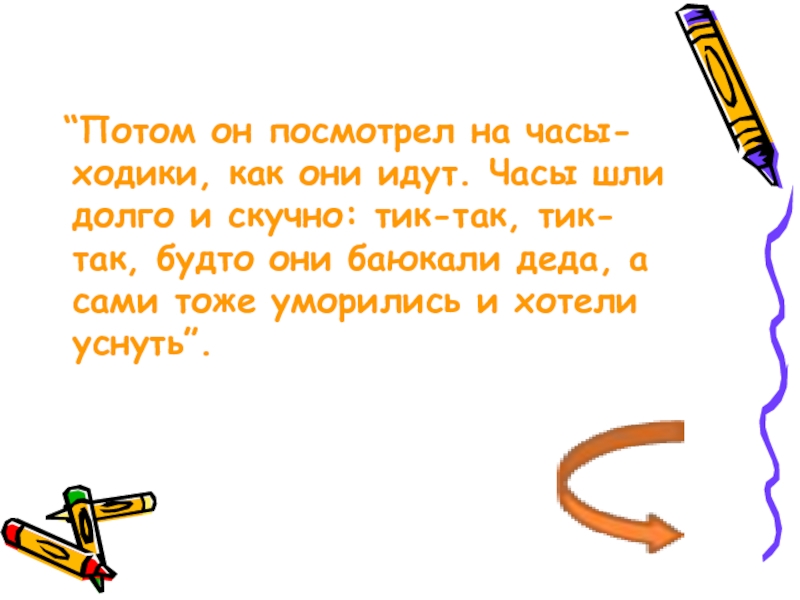 Слайд 15 “Потом он посмотрел на часы-ходики, как они идут. Часы шли
