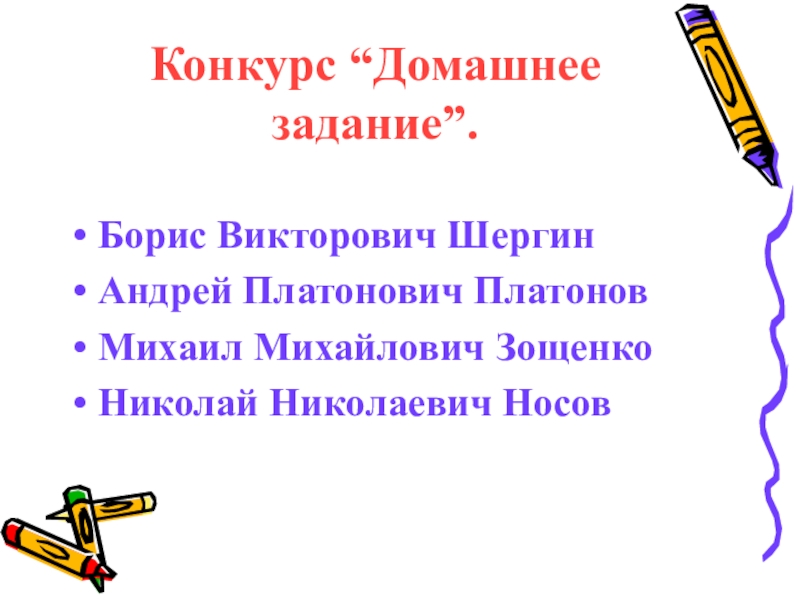 Конкурс “Домашнее задание”.Борис Викторович ШергинАндрей Платонович ПлатоновМихаил Михайлович ЗощенкоНиколай Николаевич Носов