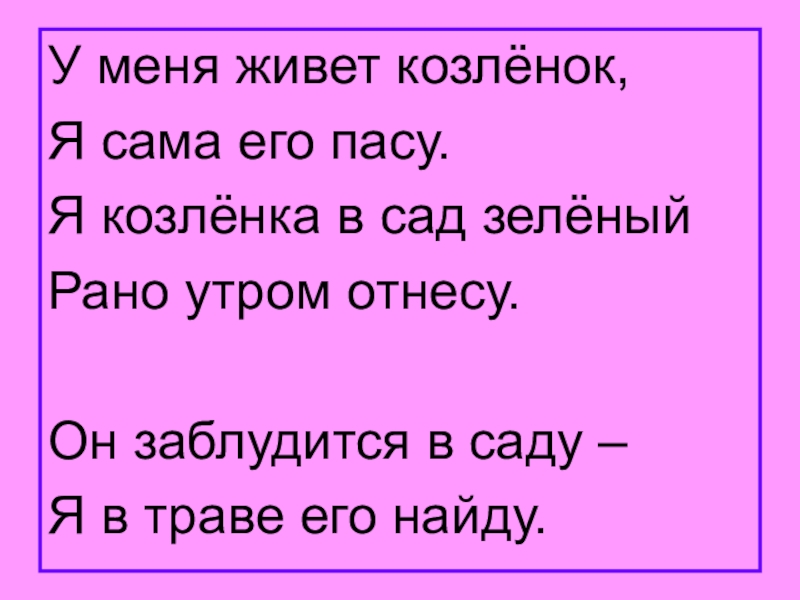 У меня живет козлёнок,Я сама его пасу.Я козлёнка в сад зелёный Рано утром отнесу.Он заблудится в саду