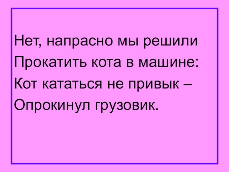 Нет, напрасно мы решилиПрокатить кота в машине:Кот кататься не привык – Опрокинул грузовик.