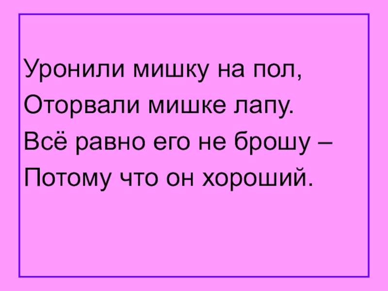 Уронили мишку на пол,Оторвали мишке лапу.Всё равно его не брошу – Потому что он хороший.
