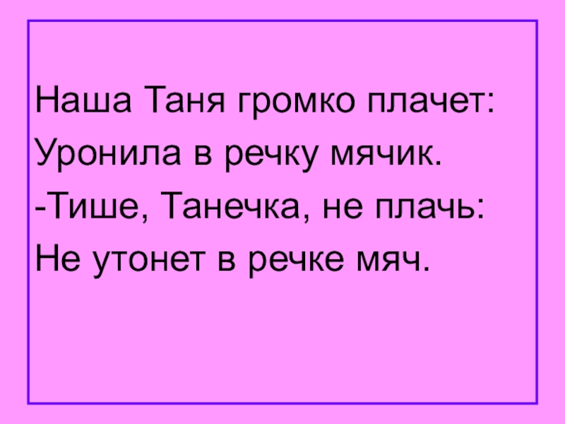 Наша Таня громко плачет:Уронила в речку мячик.-Тише, Танечка, не плачь:Не утонет в речке мяч.