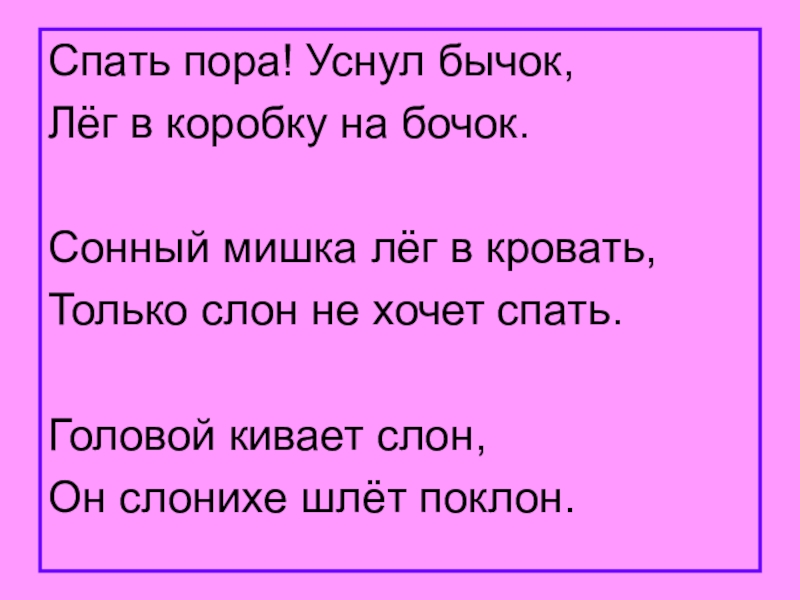Спать пора! Уснул бычок,Лёг в коробку на бочок.Сонный мишка лёг в кровать, Только слон не хочет спать.Головой