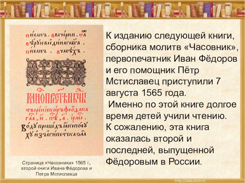 К изданию следующей книги, сборника молитв «Часовник», первопечатник Иван Фёдоров и его помощник Пётр Мстиславец приступили 7 августа 1565 года.