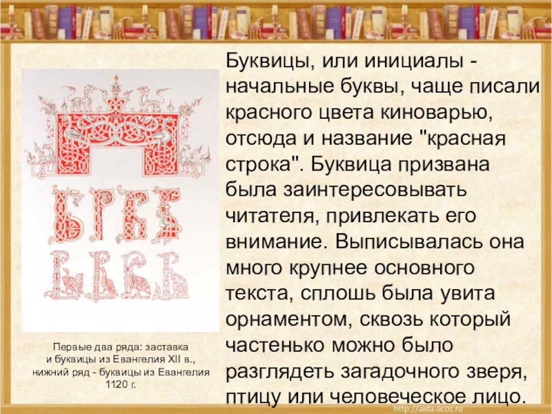 и буквицы из Евангелия XII в., нижний ряд - буквицы из Евангелия 1120 г.