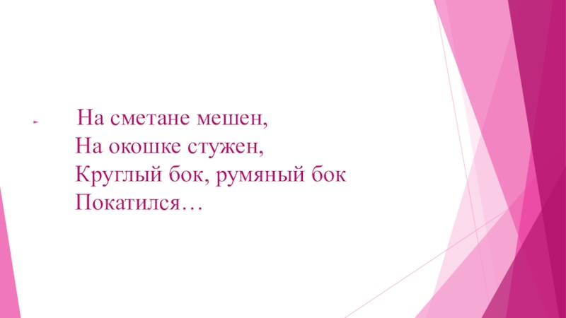 На сметане мешен,     На окошке стужен,     Круглый бок, румяный бок     Покатился…