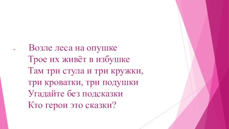 Возле леса на опушке    Трое их живёт в избушке    Там три стула и три кружки,    три кроватки, три подушки    Угадайте без подсказки    Кто герои это сказки?
