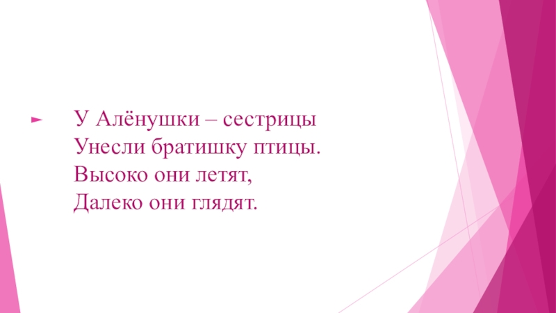 Слайд 4 У Алёнушки – сестрицы     Унесли братишку птицы.     Высоко они летят,      Далеко они