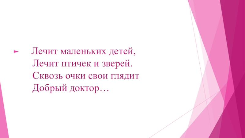 Лечит маленьких детей,     Лечит птичек и зверей.     Сквозь очки свои глядит     Добрый доктор…