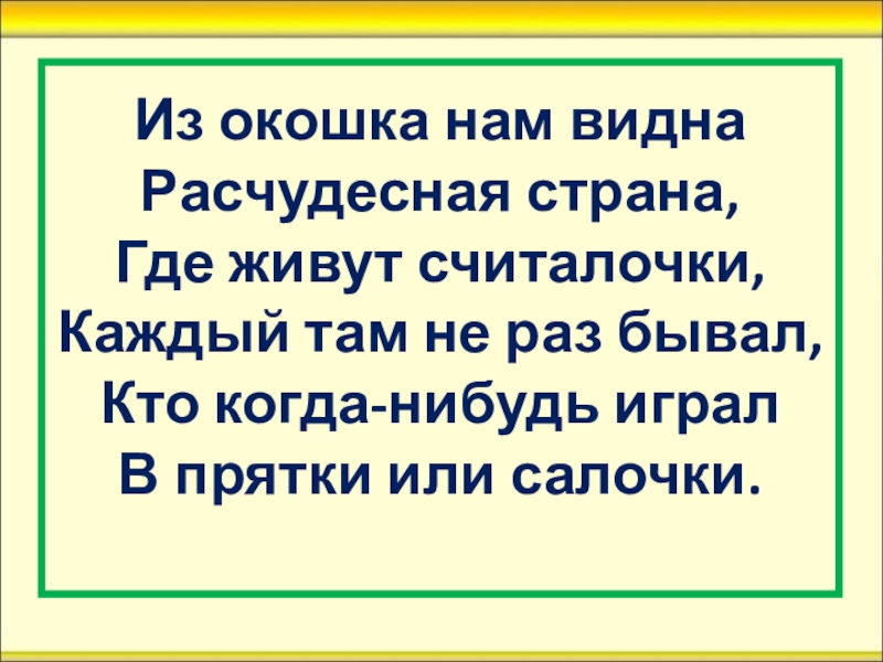 Из окошка нам видна Расчудесная страна, Где живут считалочки, Каждый там не раз бывал, Кто когда-нибудь играл
