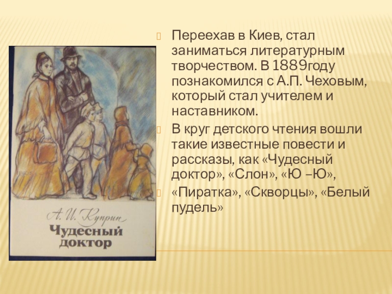 Слайд 9Переехав в Киев, стал заниматься литературным творчеством. В 1889году познакомился с