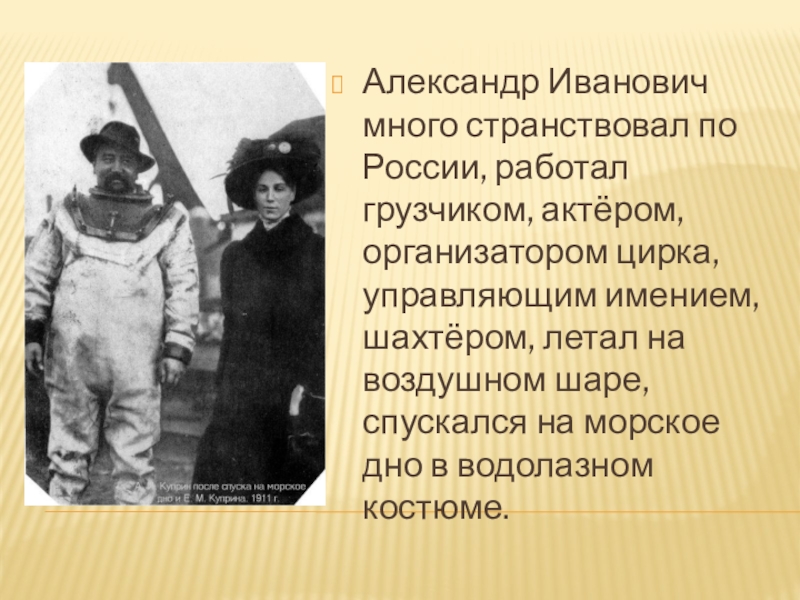 Слайд 8Александр Иванович много странствовал по России, работал грузчиком, актёром, организатором цирка,