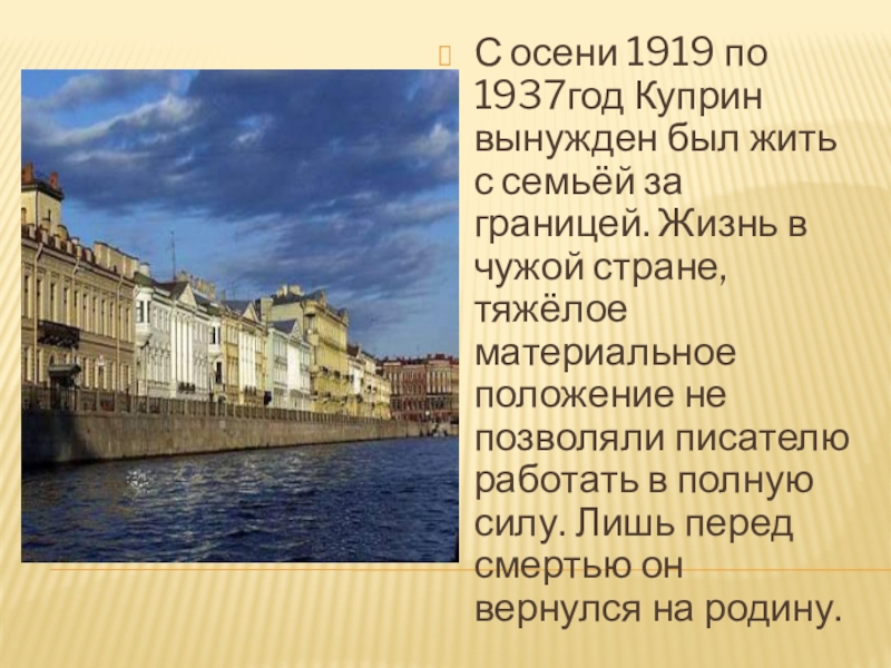 Слайд 12С осени 1919 по 1937год Куприн вынужден был жить с семьёй