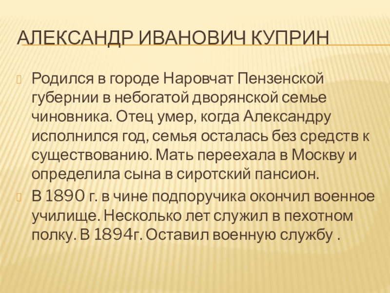 Александр Иванович КупринРодился в городе Наровчат Пензенской губернии в небогатой дворянской семье чиновника. Отец умер, когда Александру