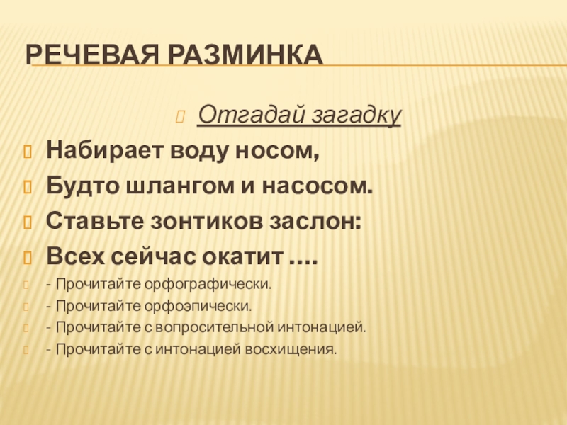 Речевая разминкаОтгадай загадкуНабирает воду носом,Будто шлангом и насосом.Ставьте зонтиков заслон:Всех сейчас окатит ….- Прочитайте орфографически.- Прочитайте орфоэпически.- Прочитайте с вопросительной интонацией.- Прочитайте с интонацией восхищения.