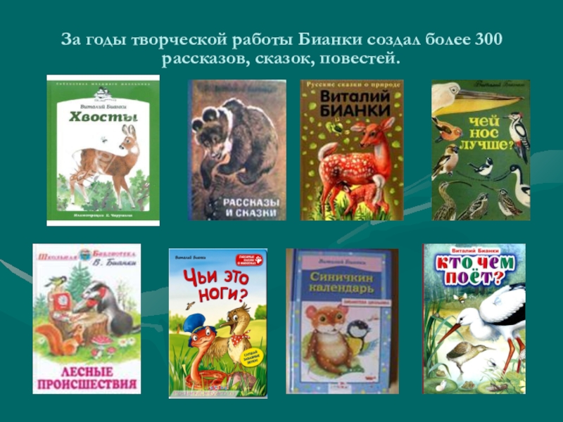 За годы творческой работы Бианки создал более 300 рассказов, сказок, повестей.