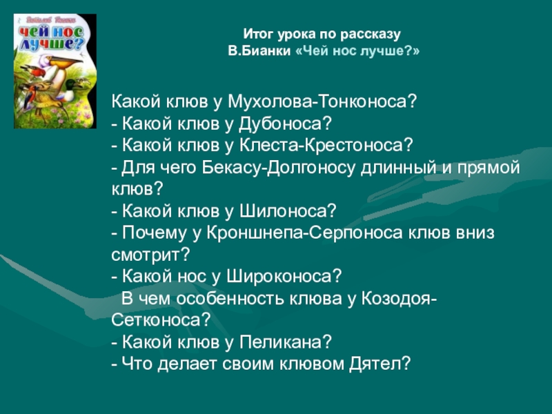 Итог урока по рассказу В.Бианки «Чей нос лучше?»  Какой клюв у Мухолова-Тонконоса? - Какой клюв у