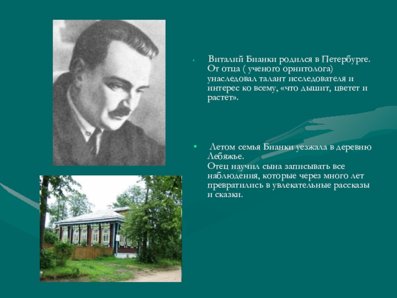 Виталий Бианки родился в Петербурге. От отца ( ученого орнитолога) унаследовал талант исследователя и интерес ко всему, «что дышит, цветет и растет». Летом семья Бианки уезжала в деревню Лебяжье.