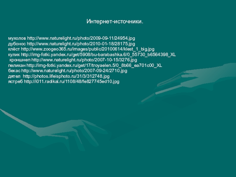 Интернет-источники.мухолов http://www.naturelight.ru/photo/2009-09-11/24954.jpg дубонос http://www.naturelight.ru/photo/2010-01-18/28175.jpg клёст http://www.zoogeo365.ru/images/public/20100614/klest_1_big.jpg кулик http://img-fotki.yandex.ru/get/5908/bu-barabashka.6/0_55730_b6564398_XL кроншнеп http://www.naturelight.ru/photo/2007-10-15/3276.jpg пеликан http://img-fotki.yandex.ru/get/17/troyaelen.5/0_8b66_ea701c00_XL бекас http://www.naturelight.ru/photo/2007-09-24/2710.jpgдятел http://photos.lifeisphoto.ru/31/3/312748.jpg ястреб http://i011.radikal.ru/1108/48/fe827745ed10.jpg