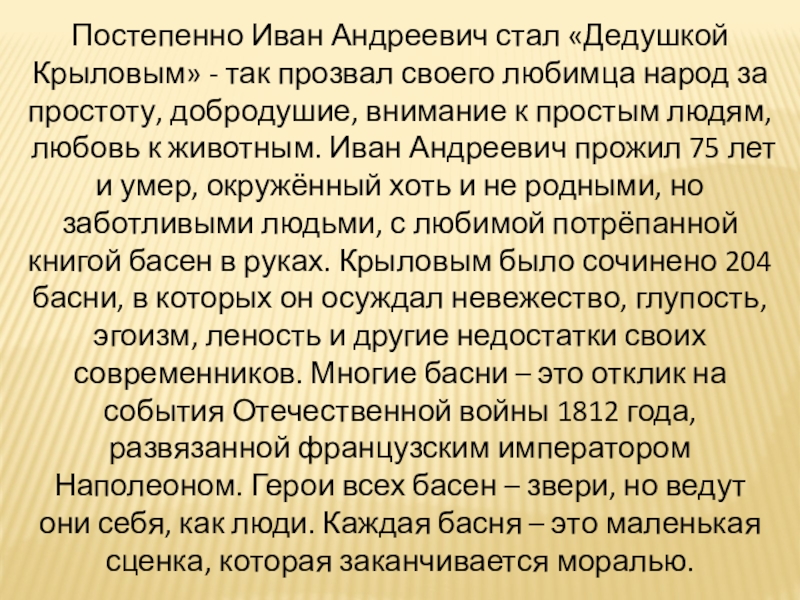 народ за простоту, добродушие, внимание к простым людям, любовь к животным. Иван Андреевич прожил 75 лет и умер, окружённый хоть и не родными, но заботливыми людьми, с любимой потрёпанной книгой басен в руках. Крыловым было сочинено 204 басни, в которых он осуждал невежество, глупость, эгоизм, леность и другие недостатки своих современников. Многие басни – это отклик на события Отечественной войны 1812 года, развязанной французским императором Наполеоном. Герои всех басен – звери, но ведут они себя, как люди. Каждая басня – это маленькая сценка, которая заканчивается моралью.