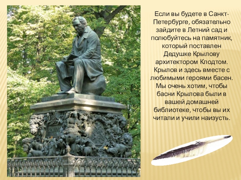 полюбуйтесь на памятник, который поставлен Дедушке Крылову архитектором Клодтом. Крылов и здесь вместе с любимыми героями басен. Мы очень хотим, чтобы басни Крылова были в вашей домашней библиотеке, чтобы вы их читали и учили наизусть.