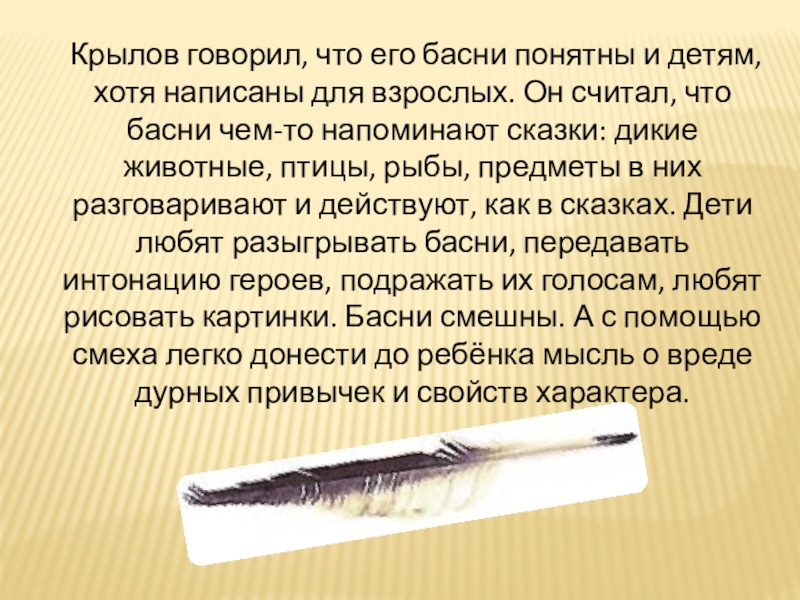 Слайд 7 Крылов говорил, что его басни понятны и детям, хотя написаны