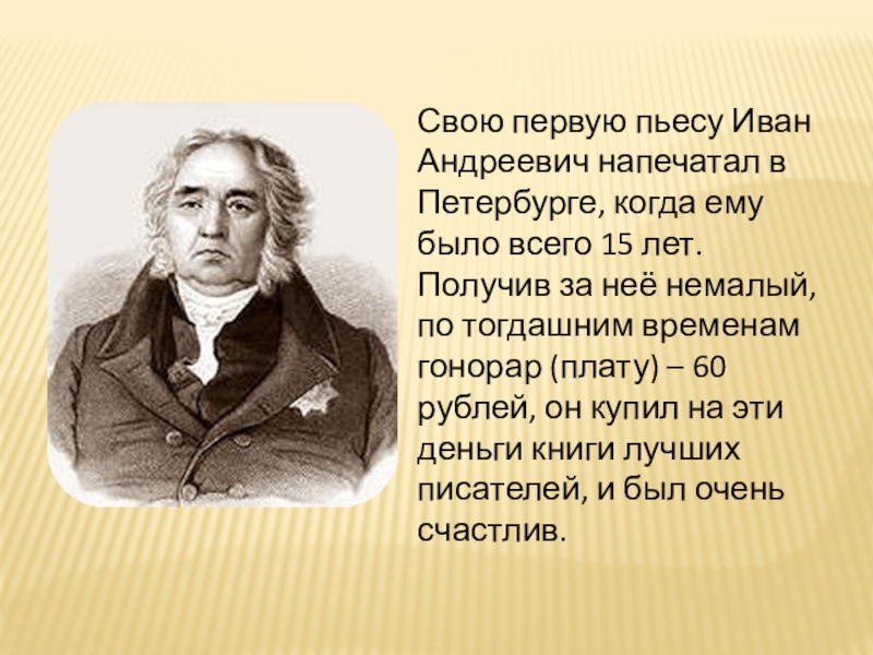 Слайд 4Свою первую пьесу Иван Андреевич напечатал в Петербурге, когда ему было