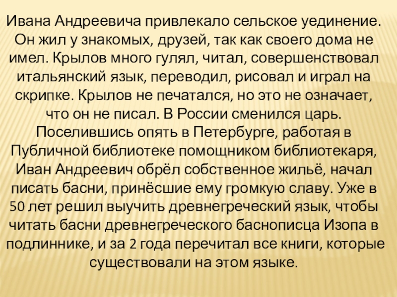 как своего дома не имел. Крылов много гулял, читал, совершенствовал итальянский язык, переводил, рисовал и играл на скрипке. Крылов не печатался, но это не означает, что он не писал. В России сменился царь. Поселившись опять в Петербурге, работая в Публичной библиотеке помощником библиотекаря, Иван Андреевич обрёл собственное жильё, начал писать басни, принёсшие ему громкую славу. Уже в 50 лет решил выучить древнегреческий язык, чтобы читать басни древнегреческого баснописца Изопа в подлиннике, и за 2 года перечитал все книги, которые существовали на этом языке.